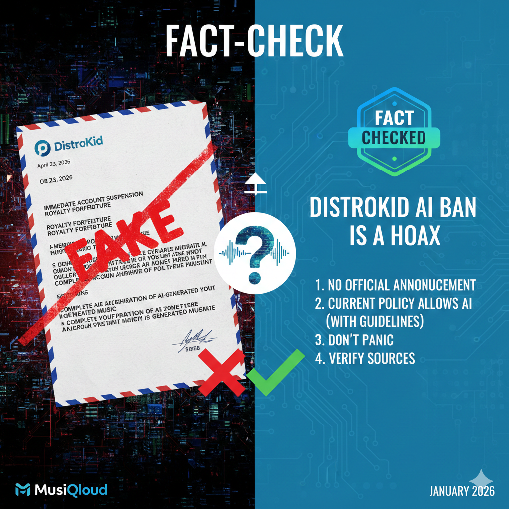 The alleged DistroKid AI ban letter is a fabricated document. There is currently no evidence that DistroKid plans to ban AI-generated music in 2026.
