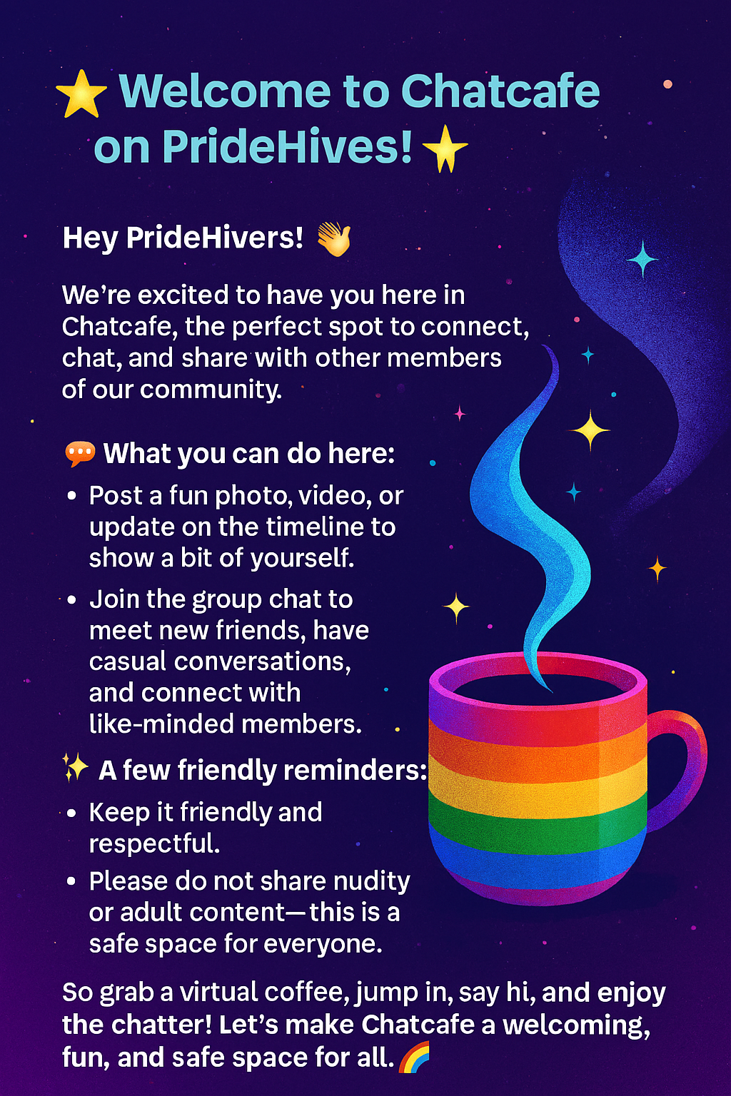 Welcome to the Pridehives Chatcafe, on PrideHives! This group is your go-to spot for **casual conversations, making connections, and having fun** with other members of our community. Here, you can introduce yourself, share a little about who you are, and get to know others in a friendly, supportive environment.